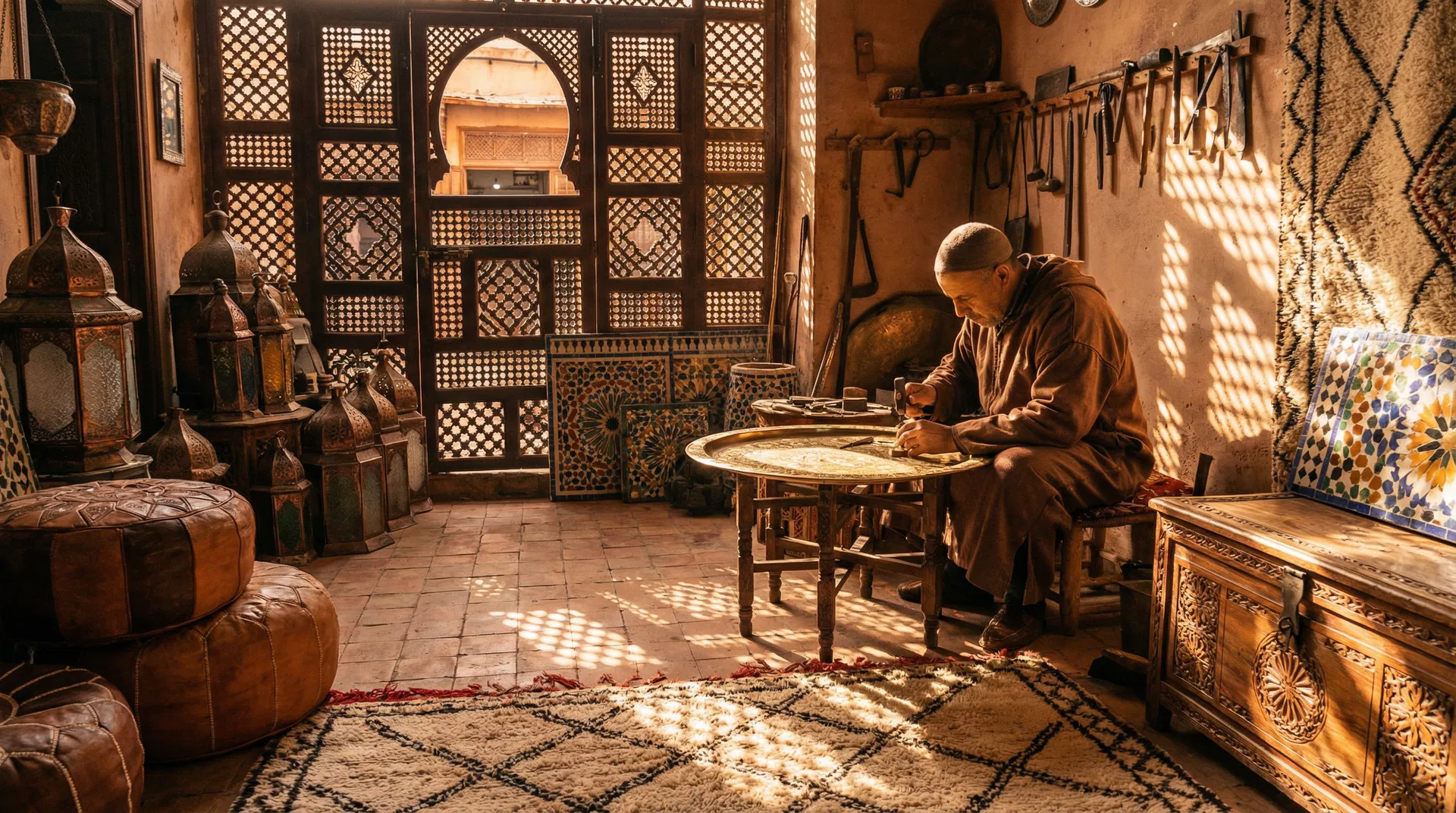 Nous sommes basés à Marrakech, au cœur des souks et des ateliers. Pas d'intermédiaire, pas de surcoût — vous accédez directement aux artisans avec nos prix négociés.